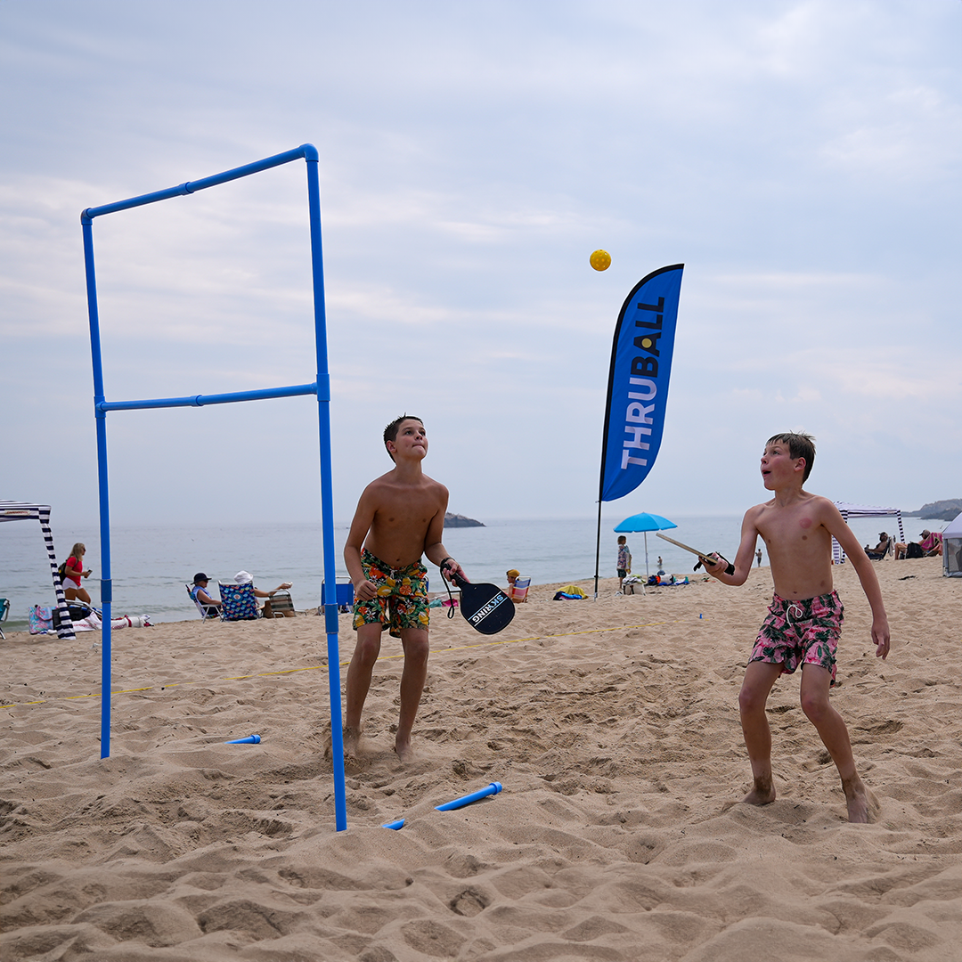 Introducing Thruball - The thrilling, action-packed outdoor sensation that combines elements of Pickleball, Volleyball, and Spikeball, delivering an adrenaline-pumping experience! Get ready to enjoy the fun of Thruball in your own backyard or easily transport Thruball to the beach for an unforgettable day in the sun with family and friends. Let the laughter, cheers, and high-fives echo as you experience the exciting gameplay of Thruball for yourself!